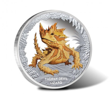 A colored reverse design on the silver coin depicts a single thorny devil lizard in a classic stance. The coin is struck from one ounce of 99.9% pure silver with a maximum mintage of 5,000.