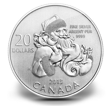The 2013 $20 Silver Santa Commemorative Coin is available from the Royal Canadian Mint, while the 225,000 mintage lasts. Orders from Canada and the United States may be made via the RCM website on the $20 for $20 page. A household order limit of three is in place.